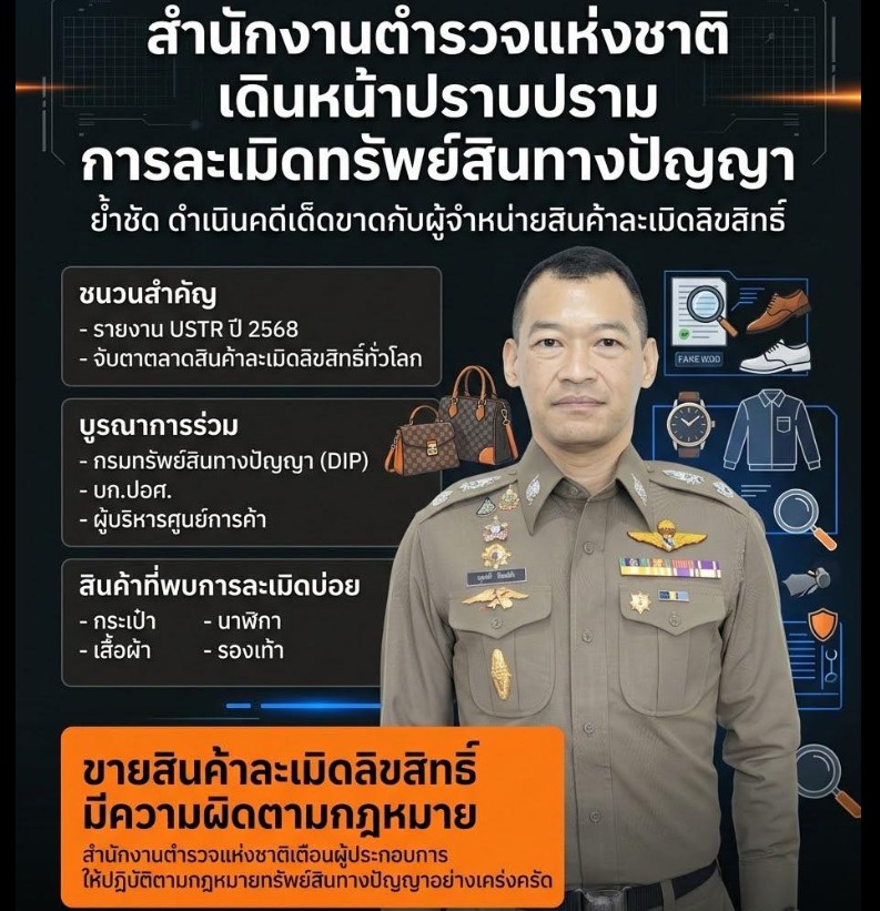 สำนักงานตำรวจแห่งชาติ โดย พล.ต.ต.จตุรภัทร์ ภิรมย์แก้ว รองโฆษกสำนักงานตำรวจแห่งชาติ ยืนยันความมุ่งมั่นในการกวาดล้างการละเมิดทรัพย์สินทางปัญญาทั่วประเทศ สอดรับกับรายงานระดับโลก