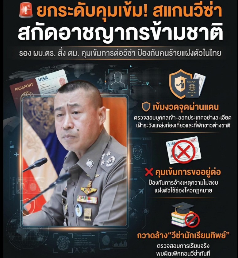 พล.ต.อ.สำราญ นวลมา รอง ผบ.ตร.ยกระดับคุมเข้ม! รอง ผบ.ตร. สั่ง ตม. สแกนเข้มการต่อวีซ่า สกัดกั้นอาชญากรข้ามชาติแฝงตัวในไทย